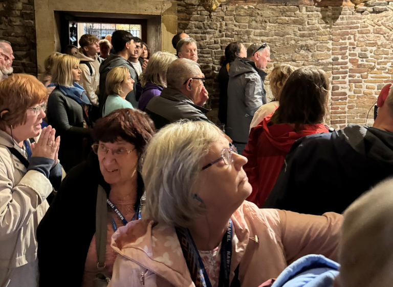 Although on a hectic schedule, our group was grounded with daily Mass, group prayer and Catholic insights offered by our spiritual leader, Fr. James Campbell, pastor of Saint Patrick Parish in Franklin. Pilgrims in our group represented several parishes: Saint Jude, Sacred Heart/Saint Paul in Erie, Saint Boniface in Kersey and Saint Mary and Queen of the World in Saint Marys. Deacon Joe Persinger and his wife, Julia, who spend their time between Erie and Saint Jude Parish, and the US Naval Academy in Annapolis, where Deacon Joe serves as chaplain, were also included. Earpieces used throughout the visit enabled Fr. James to privately lead us in prayer while touring.