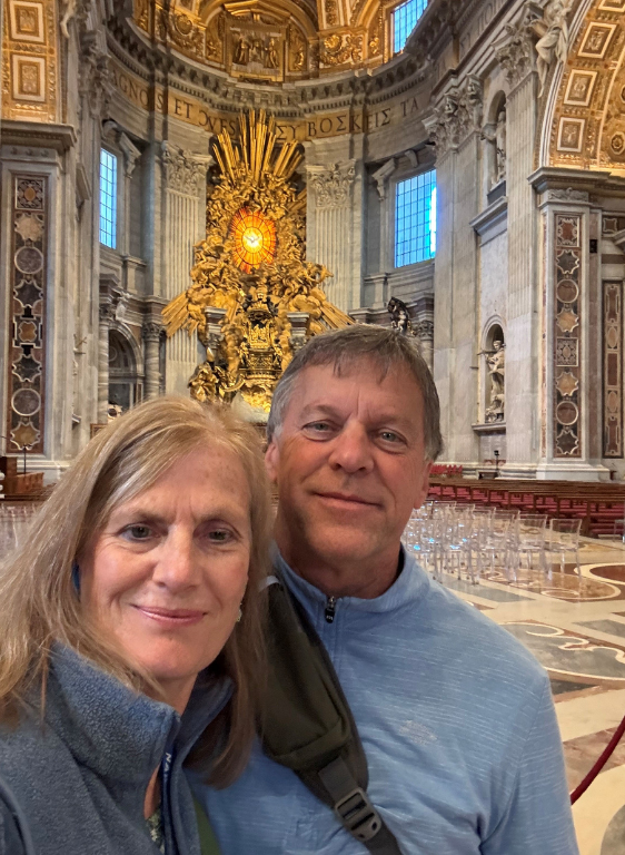 “Andiamo” means “let’s go.” Now to Rome, where this group of pilgrims passed through all four Holy Doors in the Basilicas of Saint Mary Major, where Pope Francis is buried, Saint John Lateran, Saint Paul Outside the Walls and Saint Peter. Private mass for the group that day was in a chapel in the crypt of Saint Peter Bascilica. A fascinating tour of the Catacombs of Saint Sebastian along the Appian Way just outside the center city of Rome specially honors this martyr and saint who was buried there in the 3rd century. Not lost on we two Louises is that Saint Sebastian inspired our youngest son’s confirmation name. In divine fashion, that makes for three of our four children’s confirmation namesakes extraordinarily witnessed to us on an itinerary we did not plan.
